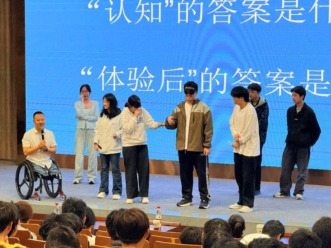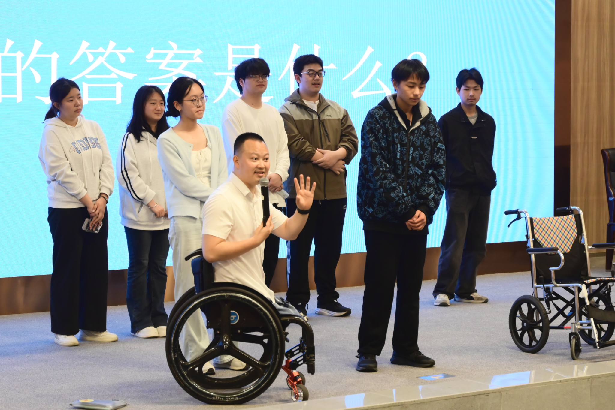 在互动环节,代国宏老师邀请现场同学亲身参与“无手刷牙”“蒙眼行走”“轮椅行动”等活动。在模拟残障状态的过程中,同学们真切感受到了日常生活中的种种不便与艰辛,也更加深刻地理解代老师多年来克服困难、奋勇前行的不易。体验结束后,多位同学分享了自身感受。有同学表示“仅仅体验了几分钟,我就感到寸步难行,而代老师却用这样的身体活了十几年、拼了十几年。我还有什么理由抱怨生活?”还有同学表示:“这次活动让我第一次认真思考:如果我也遭遇不幸,我能否像他一样站起来?答案是不确定,但代老师的故事给了我勇气。